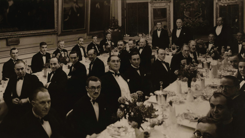 The Walter Lawrence Trophy Presentation Dinner was held at Barber-Surgeons’ Hall in 1935. Sir Walter Lawrence can be seen standing at the far end of the table, alongside Harold Gimblett, the 1935 winner of the trophy.