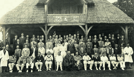 Sir Walter Lawrence sitting in the centre of the image. The image is of the annual cricket match between the head office of Walter Lawrence and Son Ltd and the Joinery Works at Sir Walter’s private ground at Hyde Hall.